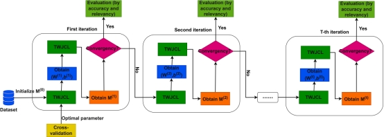 论文概述:非平行超平面分类器比平行超平面分类器具有更广泛的适用性,并且通过分别训练每个超平面来加快了训练速度,受到了广泛研究。然而,它并未考虑非平行超平面之间的相关关系。此外,由于这些非平行超平面是建立在相同的训练数据上的,可能存在由于数据冗余导致它们之间的相关性。本文中,我们研究了非平行超平面分类器的去相关问题,提出了非平行超平面去相关算法(TWJCL)。我们将非平行超平面集成到一个统一模型中,并通过联合分类器学习方法探索这种关系。以双子支持向量机为例,我们在联合问题中添加了一个新的去相关正则化项。同时,还引入了一种有效的交替优化算法来解决优化问题中的非凸问题。为了评估所提出的方法,在基准数据库的二元和多类分类数据集上进行了一系列实验,与常用的平行和非平行超平面的分类器相比,实验结果验证了所提出方法的有效性。本文总体框架见下图: