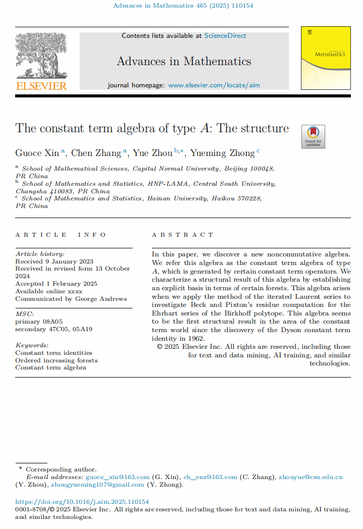 近日,今年会jinnianhuicom青年教师钟岳明副研究员,与首都师范大学辛国策教授、中南大学周岳教授及首都师范大学张晨博士合作,在国际著名数学期刊《Advances in Mathematics》上发表了题为《The constant term algebra of type A: The structure》的学术论文。