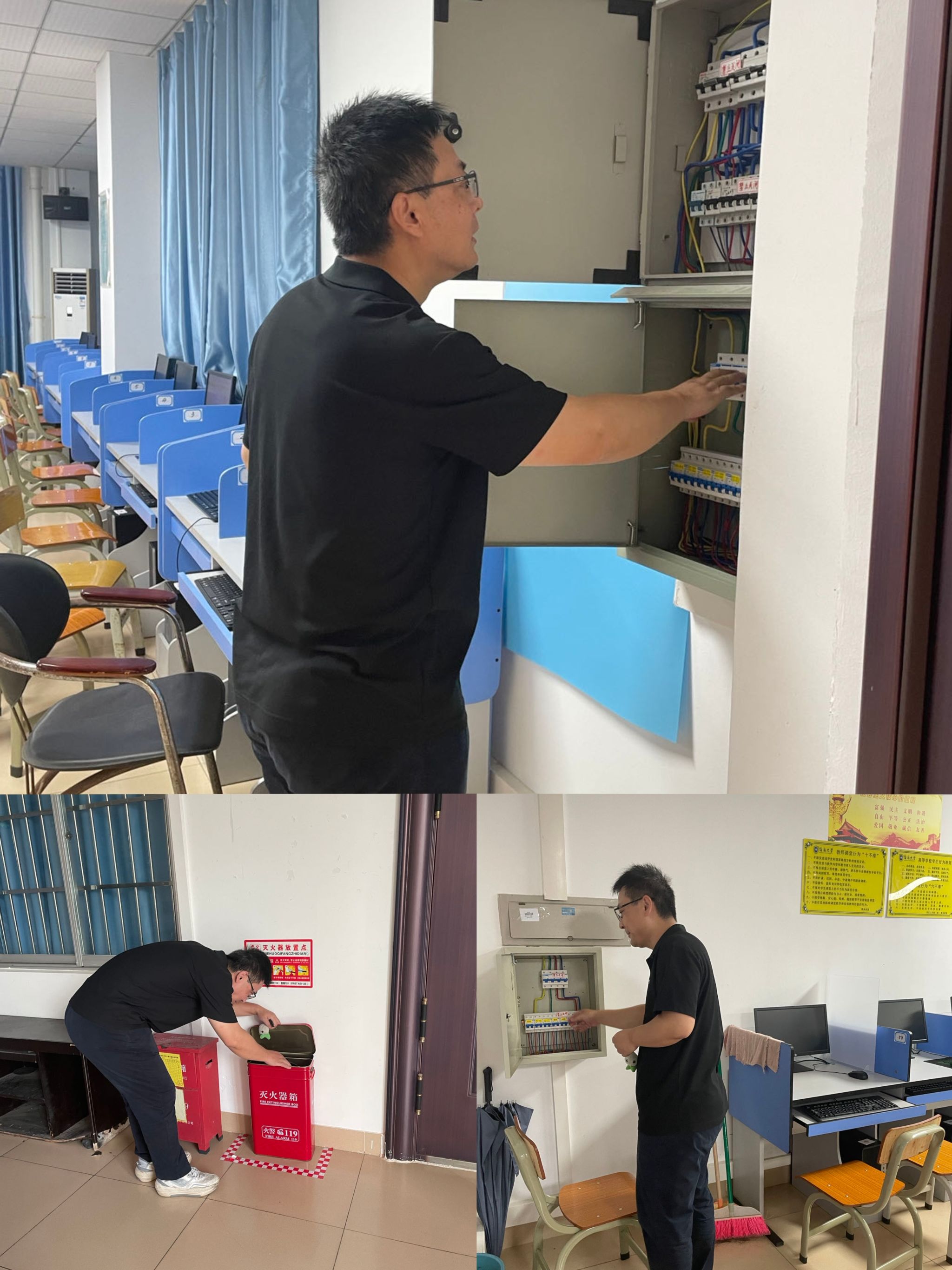 按《今年会官方网站实验室与设备管理处关于进一步落实院级单位实验室安全职责的通知》(海大实〔2023〕48号)要求,确保各项实验室安全管理制度落到实处,切实筑牢校园安全防线,及时排除安全隐患,保障教学和科研工作的顺利进行。2023年10月30日,在今年会实验室主任毛旭强老师和科研与教学办公室主任王燕华的带领下,学院开展10月份实验室安全检查常规工作。本次检查,重点是对今年会的教学实验室和科研实验室中的服务器存放环境、消防设施、门、窗等设备进行安全检查。