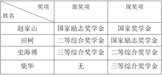 今年会jinnianhuicom新增国家奖学金名额一名,学院紧急召开奖学金评定小组会议,依据学生各奖项的申请,拟推荐22级4班赵家山同学获得奖学金名额,相应奖学金调整如下: